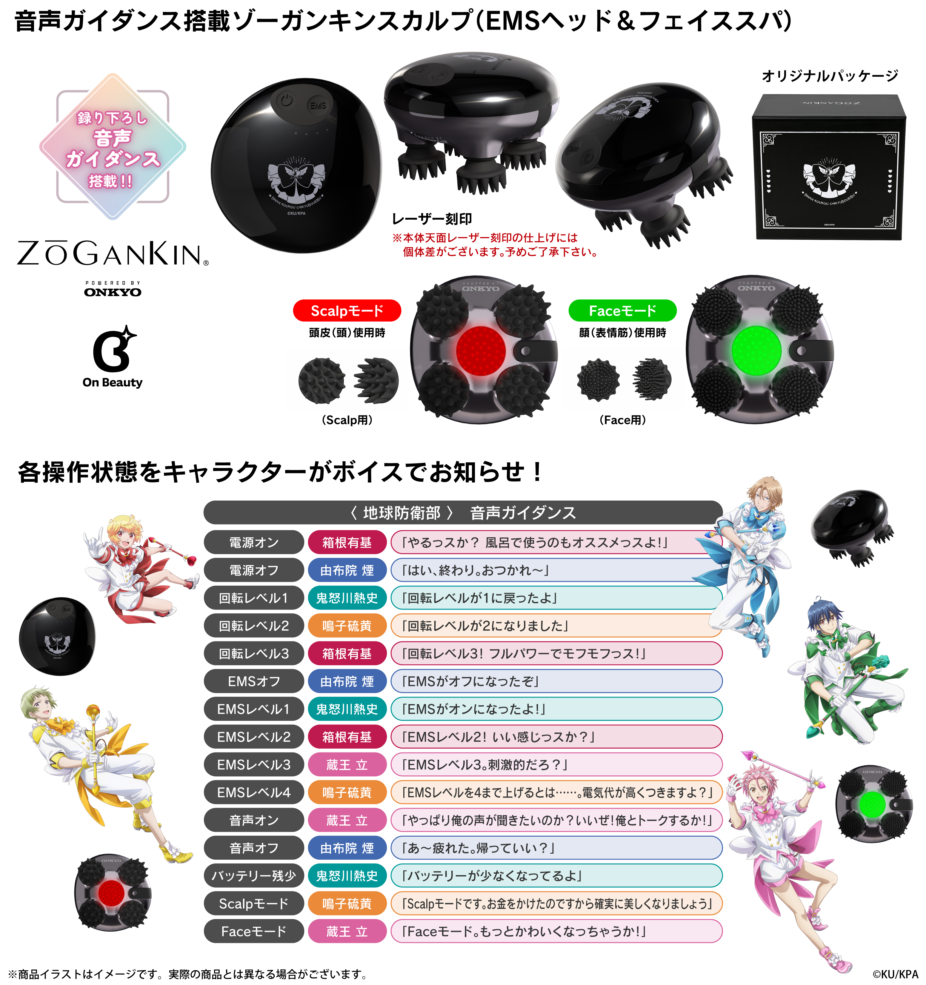 本コラボレーションモデルは、本体天面にリボンモチーフアイコンを配置。「箱根有基」「由布院煙」「鬼怒川熱史」「鳴子硫黄」「蔵王立」による新規録り下ろし掛け合いボイスを搭載。電源オンやオフ、Scalpモード、Faceモード、回転レベル、EMS等、各操作に応じてガイドしてくれるオリジナルボイス計15ワードを楽しみながら頭皮や表情筋のケアが可能です。