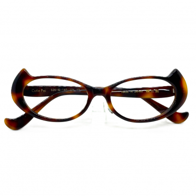 「フロント」(前枠)は、猫耳をイメージしたデザイン。「レンズの形」は、吊り上った猫目形。「テンプル」(つる)の先っぽは、猫のしっぽのようにクルンとハネ上がっています。また全体的にエッジ(角)を取って、猫の丸みをイメージした滑らかな触り心地に仕上げられています。
