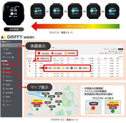 またGRIFFYが提供するクラウド計測サービスと連携し、雨量、風速、傾斜、騒音・振動、粉塵濃度などの計測値が警戒値を超過した際に、装着者に自動通知を行うことで、データ計測から現場作業員への注意喚起まで、作業プロセスの完全自動化を実現します。