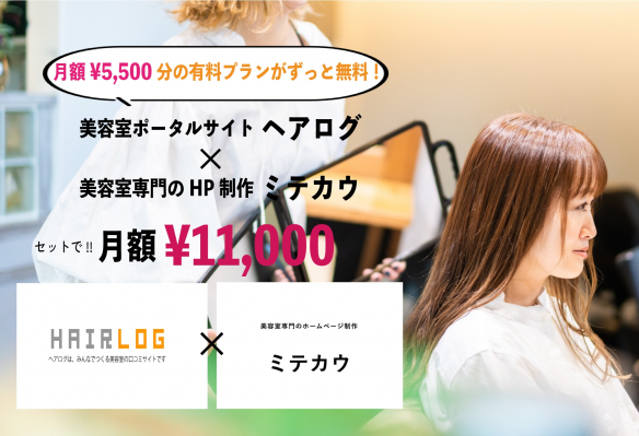 今回のサービス強化では、そんな課題を解決するために「美容室の口コミサイト『ヘアログ』の有料集客プラン(月額¥5,500分)」を無料でセット提供し、ホームページ制作から集客・予約獲得までをワンストップで支援する内容となっています。