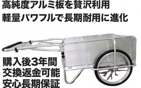 本製品は「軽量」「折り畳みリヤカー」「ノーパンクタイヤ」「送料無料」「国内倉庫に在庫あり」をすべて兼ね備えた、安くて質が良いアルミリヤカーの決定版です。