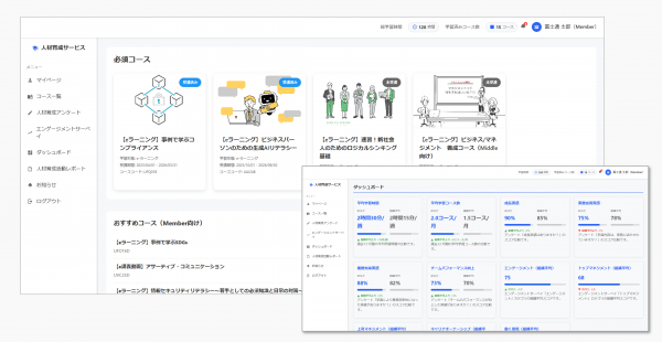 本サービスは、中堅・中小企業に勤める従業員向けの「学び放題コンテンツ」や、人材育成フレームに基づいた必須研修など、体系的な学びを通じてスキルアップを支援します。さらに、育成担当者向けの「研修効果測定」、管理職向けの「エンゲージメント測定」により組織の人材育成状況をデータ化し、育成プログラム改善と企業の成長を促進します。また、これらのサービスをポータルサイト上で一元管理し、育成活動の状況を「人材育成レポート」として可視化することで経営者をサポート。それぞれの立場で活用できる各サービスをLMS(Learning Management System: 学習管理システム)上に集約した、オールインワンパッケージとして提供いたします。