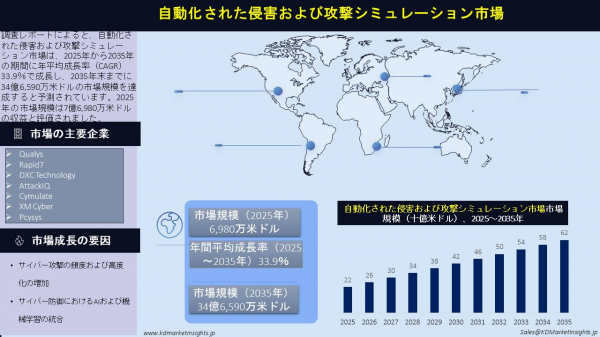 KDマーケットインサイトは、市場調査レポート『自動化された侵害および攻撃シミュレーション市場の将来動向と機会分析 - 2025年から2035年』を発表しました。本レポートの市場範囲には、現在の市場動向および将来の成長機会に関する情報が含まれており、読者が的確なビジネス判断を行うための支援を目的としています。本調査レポートでは、KDマーケットインサイトの研究者が一次および二次調査の分析手法を用いて、市場競争を評価し、競合企業のベンチマークを行い、Go-to-Market(GTM)戦略を把握しています。