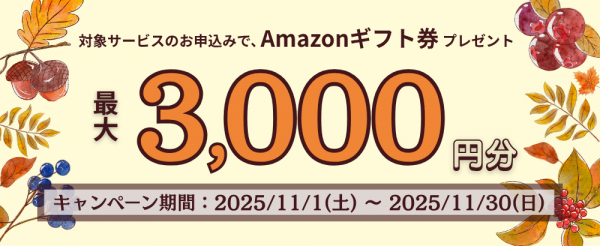 Amazonギフト券キャンペーンでは、Winserverの対象サービスにお申込みいただくと、Amazonギフト券を最大3,000円分プレゼントさせていただきます。