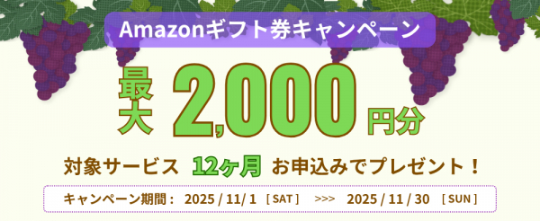 →上記サービスを契約期間12ヶ月間でご契約いただくと、Amazonギフト券2,000円分をプレゼント!