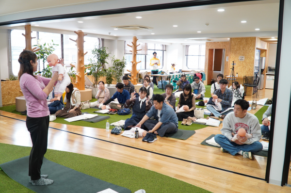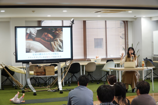 前半は、当法人 公認インストラクター 曳田彩加が、産前産後の養生法や赤ちゃんの抱っこ、遊び方についてレクチャーを行いました。