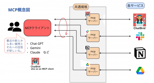 ● 柔軟な切換え:同じプロンプトから、ChatBrid・Slack・Notion・Driveなど複数のMCPサーバーを横断し、タスクに応じて切り替え可能。