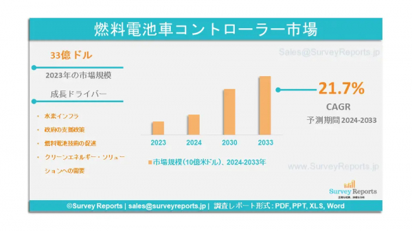 サーベイレポート合同会社は、燃料電池自動車コントローラー市場の予測評価を提供する、タイプ別(出力電流:55アーム、出力電流:65アーム、出力電流:85アーム、出力電流:110アーム);用途別(ガス管理、水熱管理、電気管理、データ通信、トラブルシューティング)-世界市場分析、動向、機会、予測、2024-2033年10月調査レポート「燃料電池自動車コントローラー市場」を出版しました。燃料電池車両コントローラー市場の成長促進要因、市場機会、課題、脅威など、いくつかの主要な市場ダイナミクスを紹介しています。