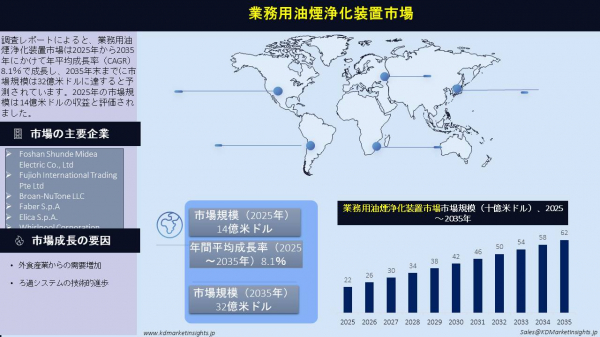 KDマーケットインサイツは、『業務用油煙浄化装置市場の将来動向と機会分析-2025年から2035年』と題した市場調査レポートの発行を発表しました。本レポートの市場範囲には、現在の市場動向および将来の成長機会に関する情報が含まれており、読者が十分な情報に基づいたビジネス上の意思決定を行うための参考資料となります。本調査レポートでは、KDマーケットインサイツの研究者が一次および二次の分析手法を用いて、市場競争の評価、競合他社のベンチマーキング、および市場参入戦略(GTM)の理解を行っています。