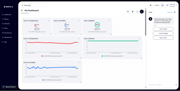 従来、IoTデータの活用には長期の開発期間や専門チームが必要でしたが、NEQTO.aiは、数分で、IoTデバイスの接続からデータの可視化、アラート設定、インサイト取得までをワンストップで可能にします。また、誰でも簡単に使えるサービスとして、非エンジニア層(オペレーターから経営者まで)が開発いらずのノーコードでダッシュボードを取り扱える環境を提供します。