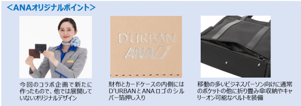 全日空商事株式会社(本社:東京都港区、代表取締役社長:宮川 純一郎)は、日本のメンズブランド「D'URBAN(以下、ダーバン)」とのコラボレーション企画として、ANAオリジナルの革小物とバッグ(計6アイテム)を発売します。10月29日よりANA公式ECサイト「ANAショッピング A-style(以下、A-style)」および「ANAショッピング A-style ANA Mall店(以下、ANA Mall店)」にて販売開始し、その後、国内線機内/ラウンジ内のANA Wi-Fi serviceからアクセスできるショッピングサイト「ANA STORE@SKY(以下、@SKY)」でも販売します。