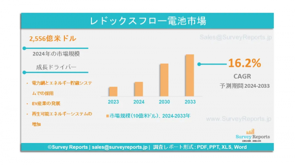 Surveyreportsの専門家は、レドックスフロー電池市場の調査を分析し、2024年に生成されたレドックスフロー電池市場規模は2556億米ドルに達すると予測した。さらに、レドックスフロー電池市場のシェアは、2033年末までに8906億米ドルに達すると予測されている。レドックスフロー電池市場は、2024年から2033年の予測期間にわたって、年平均成長率(CAGR)約16.2%で成長すると予測されている。