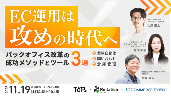 eコマースの自動化型DXサービスを提供する株式会社コマースロボティクス(本社:東京都港区、代表取締役:伊藤彰弘)は、2025年11月19日(水)14:00~より、テープス株式会社と株式会社インゲージとの3社共催ウェビナー「EC運用は『攻め』の時代へ!バックオフィス改革の成功メソッドとツール3選」をオンラインで開催いたします。