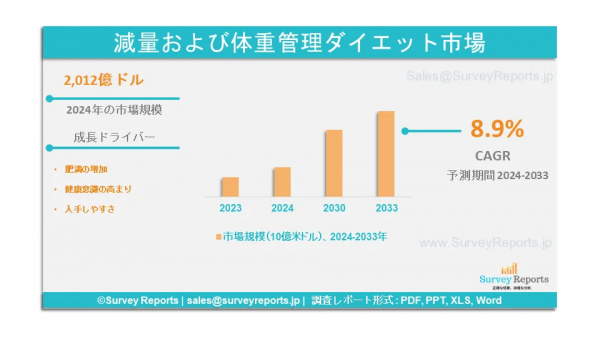 Survey Reports LLCは、2025年10月、減量および体重管理ダイエット市場の製品タイプ別(体に良い、食事代替、減量サプリメント、緑茶、低カロリー甘味料)セグメンテーションに関する調査レポートを発行したと発表した。チャネル(ハイパーマーケット/スーパーマーケット、専門店、薬局、オンラインチャネル、その他) - グローバル市場分析、動向、機会、予測、2024年から2033年)を発行した。これは、減量および体重管理ダイエット市場の予測評価を提供する。減量および体重管理ダイエット市場の成長促進要因、市場機会、課題、脅威など、いくつかの重要な市場力学に焦点を当てている。