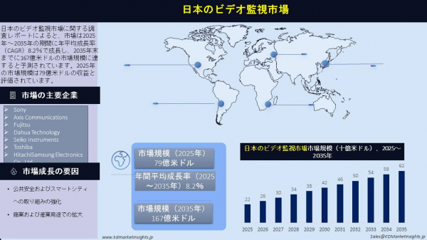 KDマーケットインサイツは、「日本のビデオ監視市場の将来動向と機会分析 - 2025~2035年」と題した市場調査レポートを発表しました。本レポートの範囲には、現在の市場動向および将来の成長機会に関する情報が含まれており、読者がより的確なビジネス判断を行うための基礎資料を提供します。本調査レポートでは、KDマーケットインサイツのリサーチャーが一次および二次調査手法を用いて、市場競争の評価、競合他社のベンチマーキング、および市場参入戦略(GTM戦略)の把握を行いました。