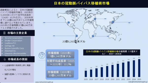 KDマーケットインサイツは、「日本の冠動脈バイパス移植術市場の将来動向と機会分析 - 2025~2035年」と題した市場調査レポートを発表しました。本レポートの範囲には、現在の市場動向および将来の成長機会に関する情報が含まれており、読者が的確なビジネス判断を行うための基礎資料を提供します。本調査レポートでは、KDマーケットインサイツのリサーチャーが一次および二次調査手法を活用し、市場競争の評価、競合他社のベンチマーキング、そして市場参入戦略(GTM戦略)の理解を行いました。
