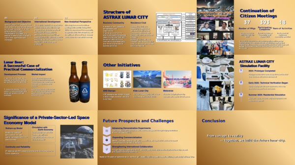 ASTRAX は2007年より、ASTRAX 月面シティと呼ばれる月面都市開発プロジェクトを推進している。このプロジェクトは、ASTRAX 月面シティビジネスコミュニティ(ビジネス活動を行う事業者のネットワーク)と、ASTRAX 月面シティレジデンスクラブ(そこで生み出された商品やサービスを享受するコミュニティ)から構成され、現在までに約 400 社の事業者が参加している。これまで、月面シティにおける経済活動の促進を目的に、月の住所管理、定期的な市民会議の開催、仮想月面都市の 3D マッピング、供給と需要のマッチングシステムの開発、専用アプリケーションの提供など、多様なプラットフォームを構築してきた。特に、市民会議は毎月開催されており、参加者による事業提案や技術交流が活発に行われている。これまでの議論の中から、宇宙環境を想定した商品開発のアイデアが生まれ、月面環境でも飲める「月面ビール」の構想が誕生するなど、具体的なビジネス展開が進んでいる。本研究では、ASTRAX 月面シティの成長過程を整理し、すでに民間企業が参加し実際の市場形成が始まっている事例に焦点を当てる。また、月面シティの事業活動を支える技術(AI、メタバース、NFT など)とその適用可能性を検討し、未来の月面経済と現実の地上経済の相互作用を分析する。さらに、実際に事業化された「月面ビール」のように、宇宙関連ビジネスが地上経済にも影響を与える事例を通じ、民間企業がどのように宇宙経済に参入できるかを考察する。