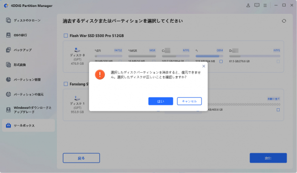 3.削除するディスクまたはパーティションを正しく選択したことを確認したら、「はい」ボタンをクリックして続行してください。