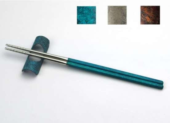 精緻な金属加工による滑らかな質感の箸に、高岡の独自の発色技術で色彩を添えた箸置きを組み合わせ、金属でありながら温もりを感じる、モダンな和のデザインに仕上げました。