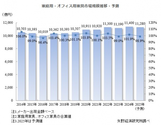 2025年の家庭用・オフィス用家具市場規模はメーカー出荷金額ベースで、前年比98.9%の1兆1,280億円を予測する。
