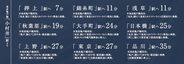 最寄り駅である東武亀戸線「小村井」駅から徒歩2分という好立地に加え、東京スカイツリーや墨田川テラスも徒歩圏内にあり、文化・再開発・利便性が融合するエリアに位置しています。