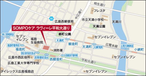 今回『ラヴィーレ平和大通り』を開設する広島市の西区都町は、広島電鉄、JR、バスの3路線が徒歩圏に揃い、ご家族さまや来訪者にとっても利便性がよく、周辺には医療機関も隣接しているため安心して暮らせる街です。