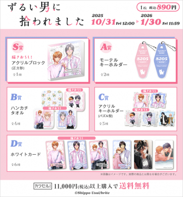 S賞は、葉月と真の新規描き下ろしイラストを使用したアクリルブロック! A賞モーテルキーホルダーは、「8205号室」のルームキーをイメージしており、鍵につけると作品の世界観をお楽しみいただけます!B賞、C賞には特別に描き下ろしていただいたミニキャライラストを使用しており、どれが当たっても嬉しい豪華ラインナップとなります!