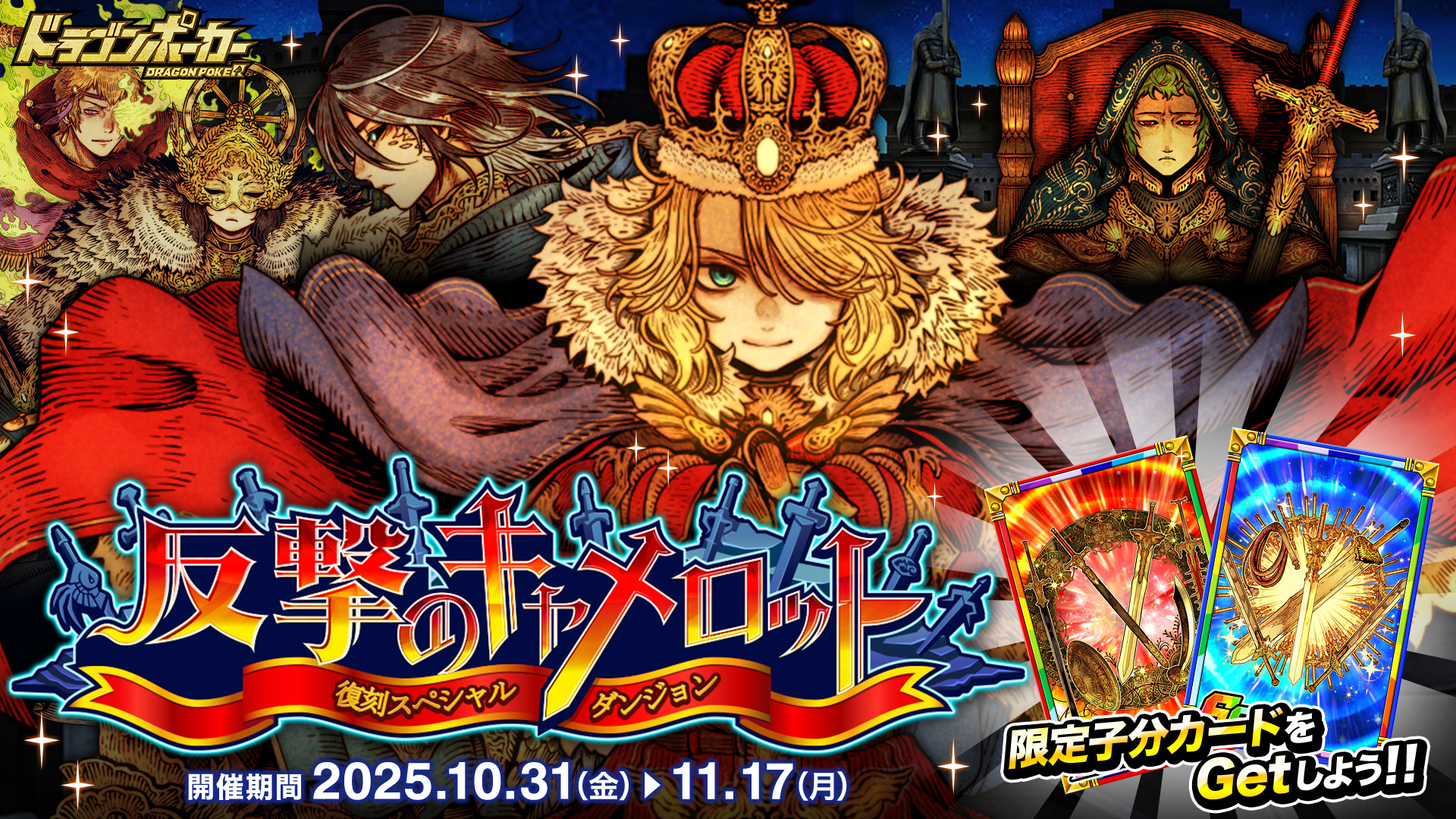 株式会社アソビズム(本社:東京都千代田区、代表取締役:大手智之)は、App Store・Google Playにて好評配信中のリアルタイム合体カードバトル『ドラゴンポーカー』で、2025年10月31日(金)より復刻スペシャルダンジョン「反撃のキャメロット」を開催いたします。