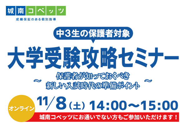 2025年11月8日(土)、株式会社城南進学研究社(所在地:神奈川県川崎市・代表取締役社長CEO:千島克哉。以下「当社」)が運営する“成績保証のある個別指導塾”「城南コベッツ」は、中学3年生のお子様をお持ちの保護者の方を対象としたセミナー「高1で決まる!大学受験攻略セミナー」をオンライン開催いたします。