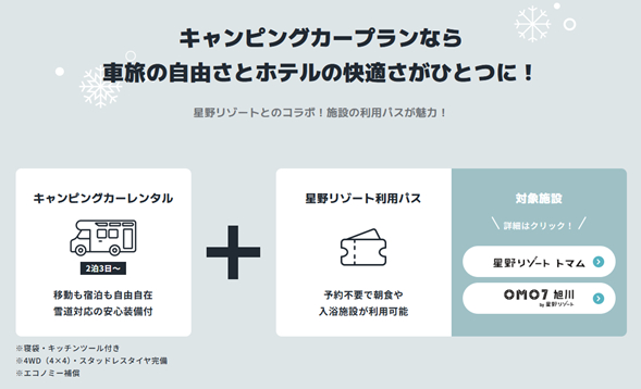 本プランは、雪道対応のキャンピングカーでの自由な移動・宿泊と、「星野リゾート トマム」「OMO7旭川 by 星野リゾート」の施設利用パスを組み合わせた、スキーヤー・スノーボーダーにとっての利便性と快適性を両立させた新しい旅のスタイルです。