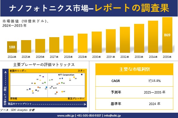 SDKI Analytics(本社:東京都渋谷区)は、このたび、2025年10月30に「ナノフォトニクス市場調査レポート:2025-2035年の市場規模、シェア、傾向の予測」を発表しました。ナノフォトニクスに関する市場調査レポートには、統計的および分析的アプローチを使用した予測評価が含まれています。この調査レポートでは、一次および二次調査方法を使用して分析された主要な業界洞察を通じて将来の傾向を理解できるようにすることで、主要な市場動向を読者に説明しています。