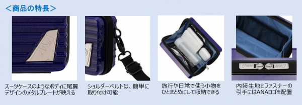 外装はスーツケースのような固く変形しづらい素材で作られており、衝撃から中身を保護します。ガジェットやコスメ、薬などの小物を整理して収納するのに便利です。ブルーとブラックは表面を傷が目立ちにくいマット仕上げとし、ゴールドは鏡面仕上げでラグジュアリーな雰囲気を醸し出し、ANA機の尾翼をイメージしたメタルプレートがシャープな印象を与えます。付属のショルダーベルトを使うことで、貴重品を携帯するミニバッグとしてお使いいただくことができ、煌めく存在感と使いやすさを兼ね備えた2wayハードケースです。用途によって色を使い分けるのもおススメです。旅行時にも普段使いにも役立つアイテムとなっています。