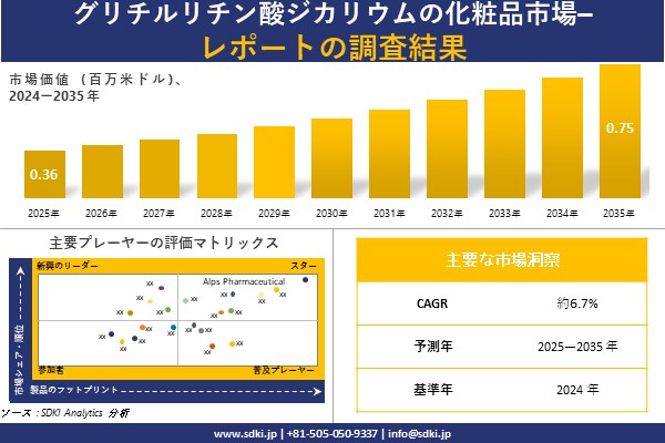 SDKI Analytics(本社:東京都渋谷区)は、このたび、2025年10月31に「グリチルリチン酸ジカリウムの化粧品市場調査レポート:2026-2035年の市場規模、シェア、傾向の予測」を発表しました。グリチルリチン酸ジカリウムの化粧品に関する市場調査レポートには、統計的及び分析的アプローチを使用した予測評価が含まれています。この調査レポートでは、一次及び二次調査方法を使用して分析された主要な業界洞察を通じて将来の傾向を理解できるようにすることで、主要な市場動向を読者に説明しています。