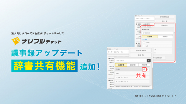 AIサービスやシステム開発を手掛けるCLINKS株式会社(本社:東京都中央区、代表取締役:河原浩介)は、企業向け生成AIチャットツール「ナレフルチャット」において、議事録生成の「辞書」共有機能を2025年11月6日(木)にリリースいたしました。これまで個人単位でのみ利用可能だった辞書登録機能に、組織全体やプロジェクト単位での共有機能を追加することで、議事録の精度向上と業務効率化を実現します。