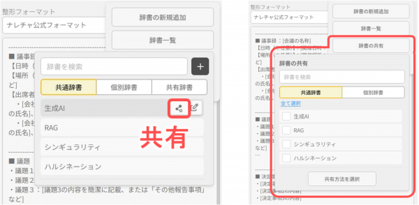 従来の辞書機能に加えて、登録した辞書を組織全体やチーム単位で共有できる機能を新たに追加しました。共有された辞書は、共有ユーザーの議事録整形時に自動的に参照され、生成AIの文字起こし字の誤変換を抑止します。