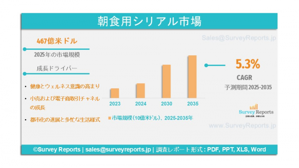Survey Reports LLCは、2025年11月に『朝食用シリアル市場のセグメンテーション:製品タイプ別(即食シリアル(RTE)およびホットシリアル)、原材料タイプ別(トウモロコシ、コメ、小麦、オーツ麦、マルチグレイン、その他)、流通チャネル別(スーパーマーケット・ハイパーマーケット、専門店、コンビニエンスストア、オンライン小売、その他)―世界市場分析、動向、機会および予測、2025~2035年』という調査報告書を発表したと明らかにした。この報告書は、朝食用シリアル市場の予測評価を提供しており、成長要因、市場機会、課題、および脅威など、同市場における主要な市場ダイナミクスを明らかにしている。