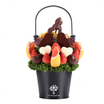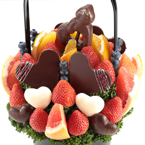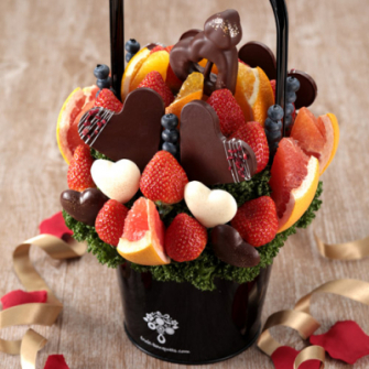 イチゴ、グレープフルーツ、ブルーベリー、オレンジをたっぷりと使い、さらに“ハート型チョコレート”やフランス産スイートチョコでコーティングしたリンゴを「ハートの矢」に見立てて、金箔をトッピングした特別なアレンジ。まさに“贈る瞬間を華やかに彩る”一品です。