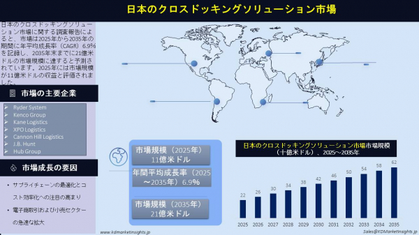 KD Market Insightsは、市場調査報告書「日本のクロスドッキングソリューション市場の将来動向と機会分析-2025年から2035年」を発表しました。本レポートは、現在の市場動向や将来の成長機会に関する情報を網羅しており、読者が十分な情報に基づいたビジネス判断を下せるよう支援するものです。本調査では、KD Market Insightsの研究者が一次および二次の分析手法を用いて、市場競争の評価、競合他社のベンチマーキング、そして市場参入(GTM)戦略の理解を行いました。