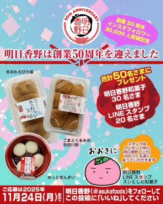 このたび、西日本のオススメ和菓子セットやLINEスタンプをお届けするキャンペーン「明日香野は創業50周年を迎えました」を開始しました。キャンペーンの開催期間は2025年11月10日から11月24日までとなります。