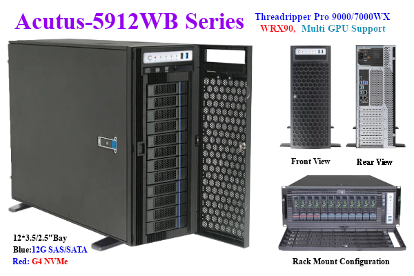 sTR5(LGA-4844)ソケットのAMD Zen5 Ryzen Threadripper Pro 9000WX/7000WX および Threadripper 9000X/7000X CPUを搭載したワークステーションで、12台の3.5/2.5インチSAS/SATA/NVMeドライブが接続可能で、ラックコンバージョンキットにより、キャビネットへの収納も可能です。