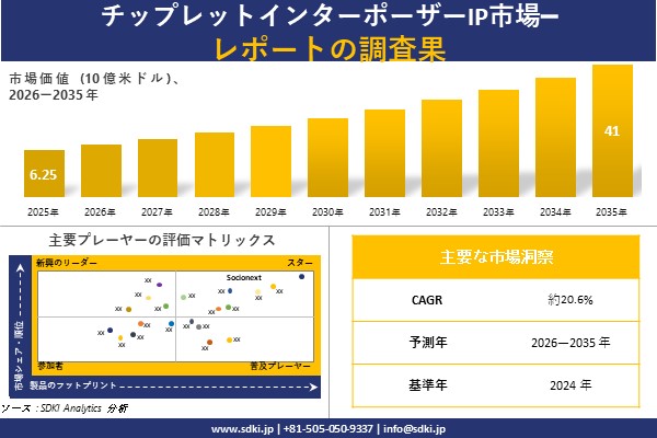 SDKI Analytics(本社:東京都渋谷区)は、このたび、2025年11月04に「チップレットインターポーザーIP市場調査レポート:2026-2035年の市場規模、シェア、傾向の予測」を発表しました。チップレットインターポーザーIPに関する市場調査レポートには、統計的および分析的アプローチを使用した予測評価が含まれています。この調査レポートでは、一次および二次調査方法を使用して分析された主要な業界洞察を通じて将来の傾向を理解できるようにすることで、主要な市場動向を読者に説明しています。