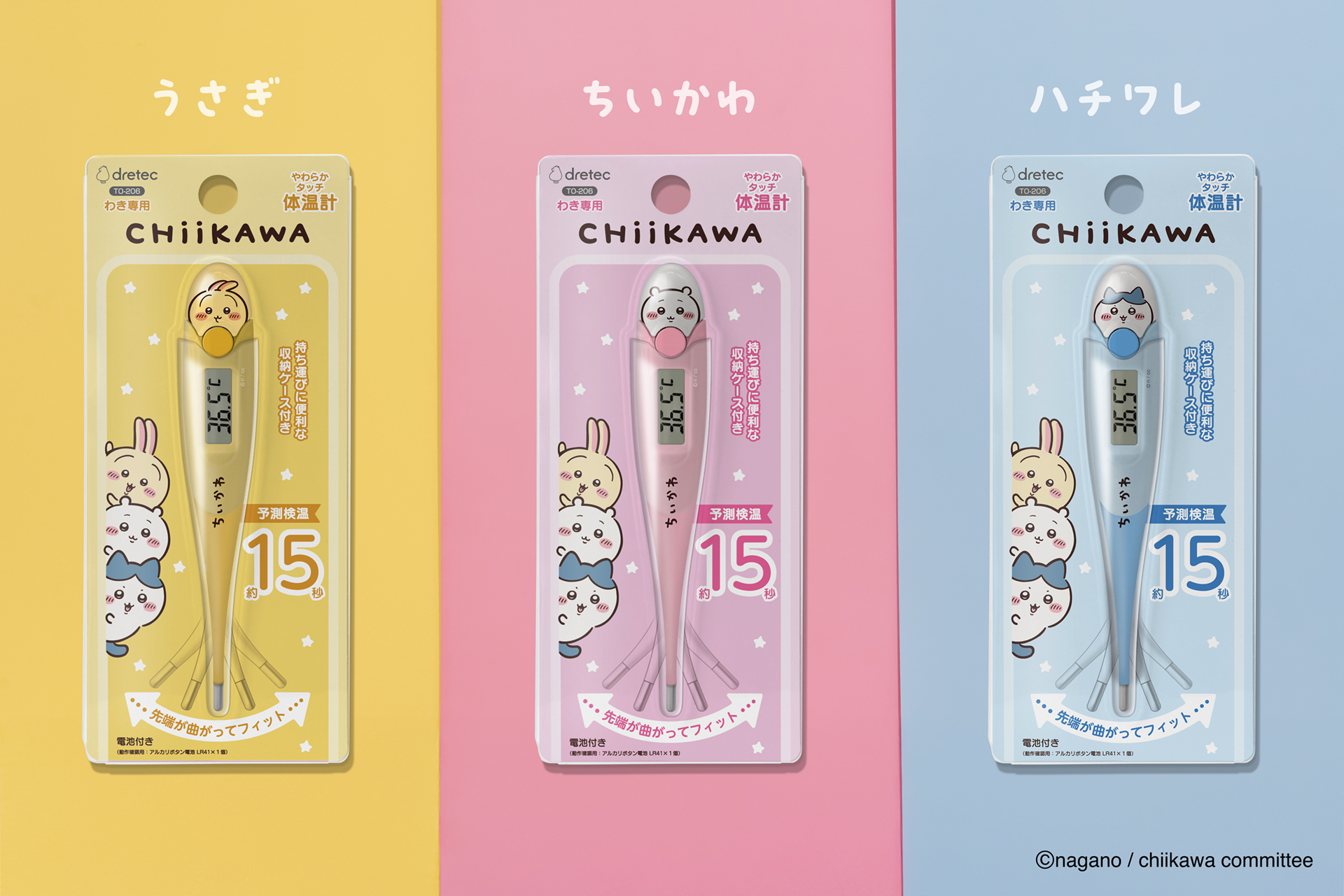 計量機器・家電・医療機器の企画販売等を行う株式会社ドリテック(本社:埼玉県川口市、代表取締役社長:千倉悟朗、以下「ドリテック」)は、アニメ『ちいかわ』に登場するキャラクターちいかわ、ハチワレ、うさぎが可愛い「やわらかタッチ体温計 ちいかわ」(各2,178円 税込参考価格)を、2025年11月28日(金)より「ちいかわマーケット」で発売いたします。また「ちいかわらんど」及びドリテック公式オンラインストア、ドラッグストア、雑貨専門店などでも12月上旬より順次販売いたします。