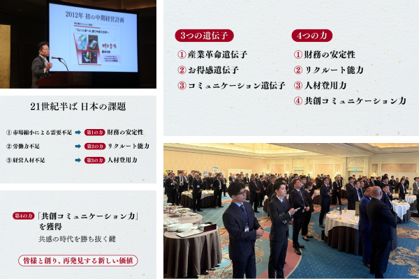 和やかな歓談を挟み、此下竜矢社長が明日香野の「3つの遺伝子」「4つの力」をキーワードにプレゼンテーションを行いました。企業を支える3つの明日香野遺伝子として、和菓子を機械で大量生産してスーパー様で消費者にお届けする「産業革命遺伝子」。消費者の皆様に毎日お届けし、毎日喜んでいただけるための「お得感遺伝子」。スーパーマーケット和菓子競合が消費者とコミュニケーションするための広告等をあまり行っていない中、ラジオやテレビ広告を積極的に取り込むことで長年のヒット作「元祖透明わらび餅」「あんこ餅」などを生み出した「コミュニケーション遺伝子」。この操業以来の遺伝子をしっかりと引き継いで守り続けることを強調しました。