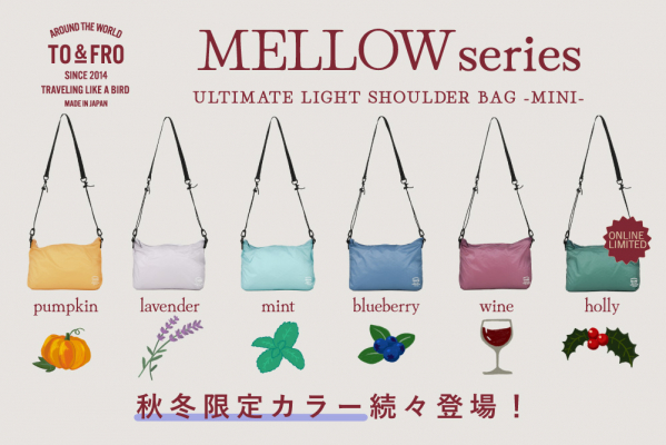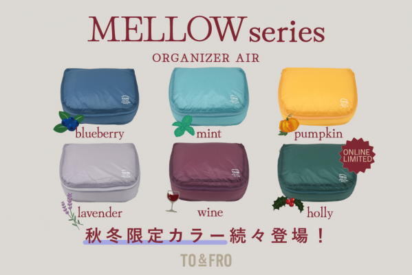 TO&FROの人気アイテムに2025年秋冬限定カラーが「MELLOW」シリーズとして6色登場いたします。今回の秋冬限定カラー「MELLOW」は、自然の美しい色彩からインスピレーションを得たラベンダー、パンプキン、ワイン、ミント、ブルーベリー、ホリーの6色。「MELLOW」は芳醇(ほうじゅん)という意味で、香りが高く、味が良いことを意味し、主にワインや日本酒などの酒に用いられる言葉です。「MELLOW」シリーズのカラーリングから、それぞれネーミングに用いた植物の豊かな生命力や心地よい香り、味わいまでイメージしていただくことを目指しました。