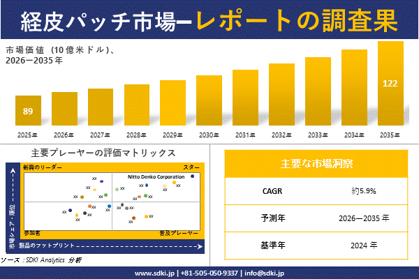 SDKI Analytics(本社:東京都渋谷区)は、このたび、2025年11月10に「経皮パッチ市場調査レポート:2026―2035年の市場規模、シェア、傾向の予測」を発表しました。経皮パッチに関する市場調査レポートには、統計的及び分析的アプローチを使用した予測評価が含まれています。この調査レポートでは、一次及び二次調査方法を使用して分析された主要な業界洞察を通じて将来の傾向を理解できるようにすることで、主要な市場動向を読者に説明しています。