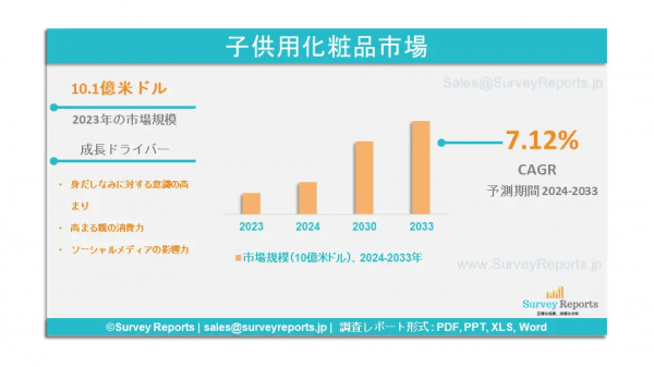 サーベイレポート合同会社は、子供用化粧品市場の予測評価を提供する2024年8月発行の調査レポート「子供用化粧品市場:カテゴリー別(オーガニック、従来型)、製品別(フェイス製品、アイ製品、リップ製品、その他)、流通チャネル別(スーパーマーケット/ハイパーマーケット、専門店、オンライン、オフライン)-世界市場分析、動向、機会、予測、2024-2033年」を発表しました。この調査レポートは、子供用化粧品市場の予測評価を提供し、成長促進要因、市場機会、課題、脅威など、いくつかの主要な市場ダイナミクスを明らかにします。