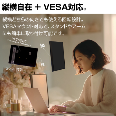 加えて、VESA規格(75×75mm)に対応しており、モニターアームや壁掛け設置にも対応。高さや角度の自由な調整が可能となり、快適な作業環境の構築にも大きく貢献します。