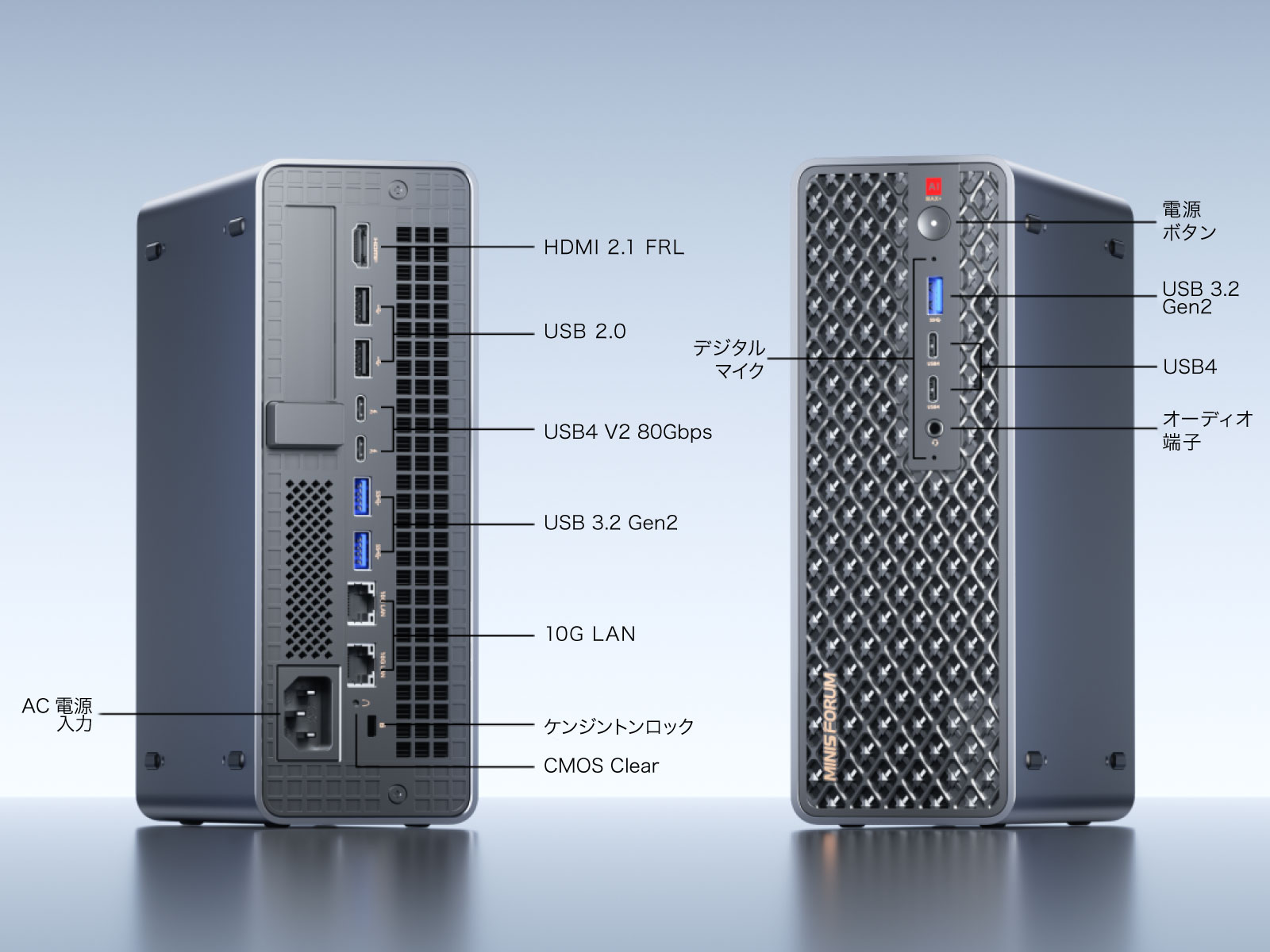 アクセスしやすい本体正面のUSB 3.2 Gen2やUSB4端子を始め、背面には80 Gbps対応のUSB4 V2端子や10 Gbps対応のLANポートなど、通常のミニPCを凌駕する超高速インターフェースを多数搭載しています。