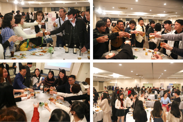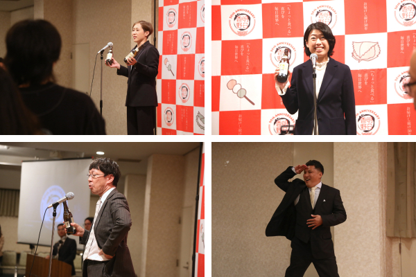 会場には、創業当時からの歴史を伝えるパネルやお客様からの声を記したディスプレイ、明日香野がサポートするアスリートを紹介するパネルなどが飾られました。和菓子という昔ながらの商品を扱いながらも、従業員の顔ぶれは国際的です。外国人雇用を推進しており、ベトナム人、ミャンマー人が数多く働いています。中でもベトナム人従業員は出席者の約6割を占めていました。