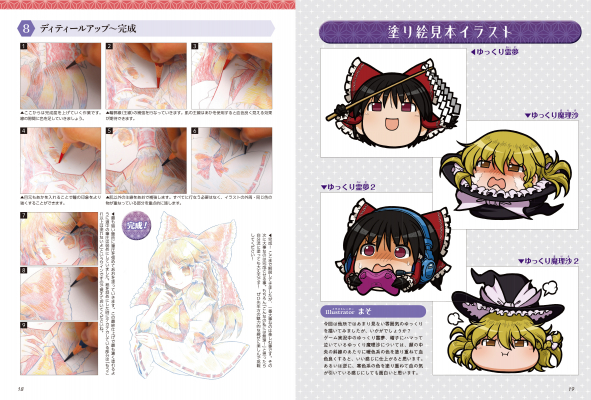 東方イラストで著名な「粗茶」、「ゆっくり霊夢」、「ゆっくり魔理沙」で有名な「まそ」など20名以上の東方絵師が参加。おなじみの大人気キャラから新規キャラまで、全31種類で贈るバラエティ豊かな塗り絵本です。